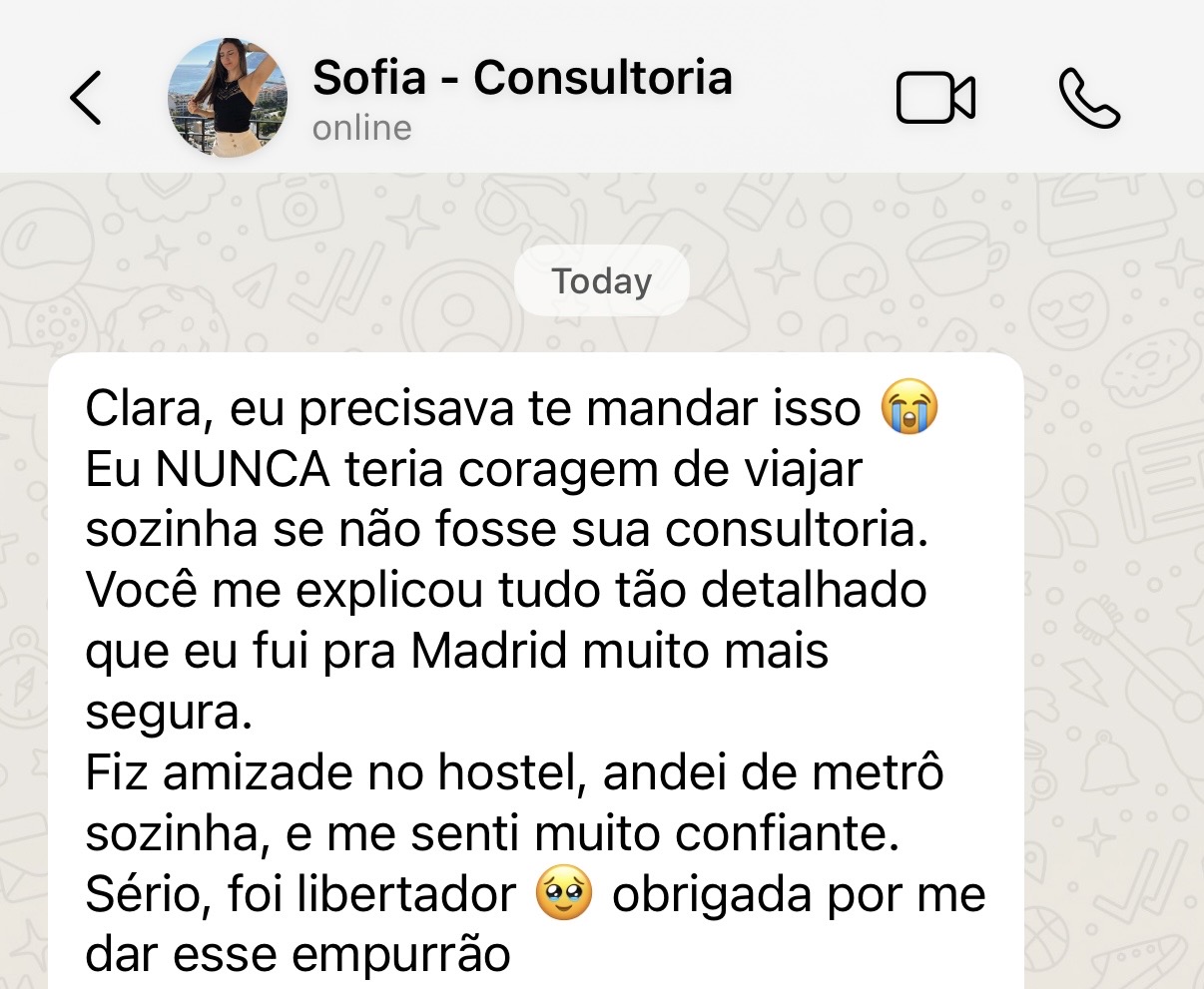 Hoje, através da minha consultoria de viagem solo e criação de roteiros personalizados, eu ajudo outras mulheres e viajantes a fazerem o mesmo: sair do papel, organizar seus planos e viver a experiência de viajar com autonomia, clareza e confiança.