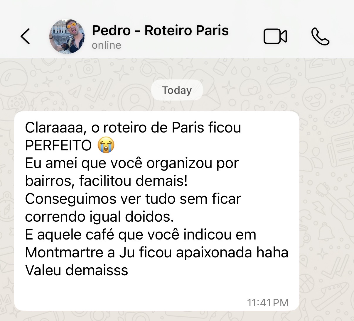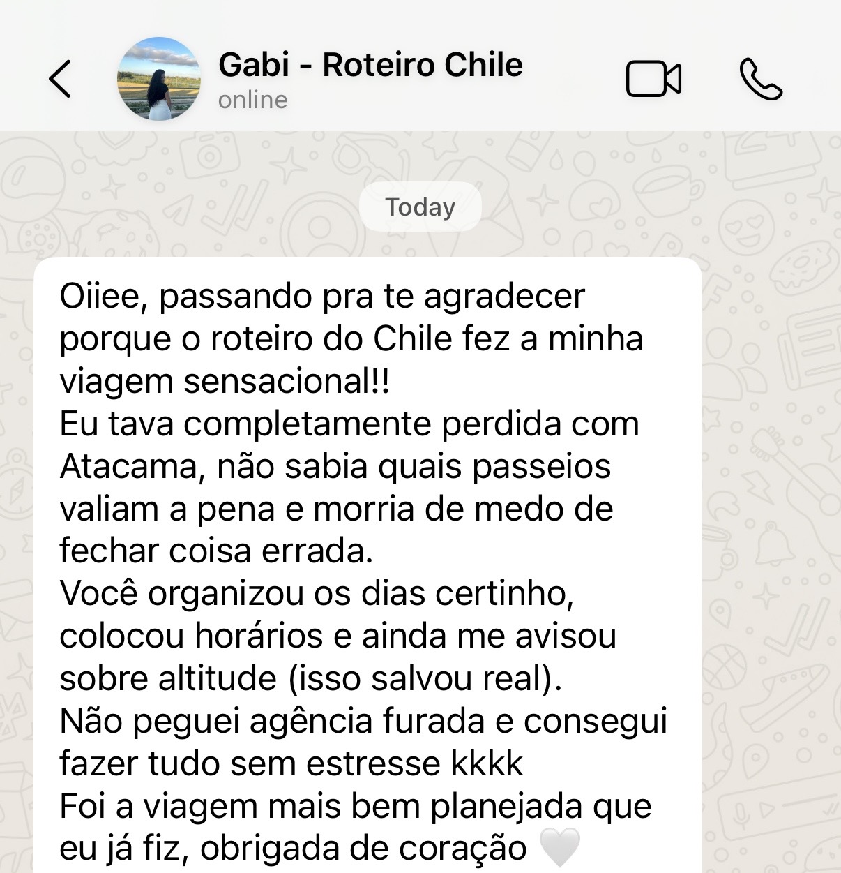 Você recebe um PDF completo e organizado com tudo o que precisa para tirar sua viagem do papel. Além disso, agendamos uma segunda video chamada para a entrega do material, onde eu explico cada detalhe do planejamento e tiro dúvidas.