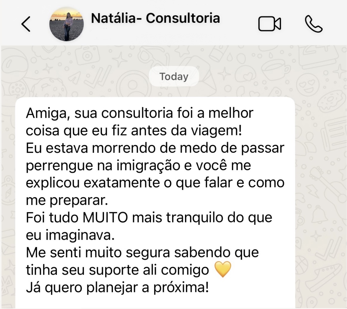 A consultoria inclui orientações específicas sobre segurança, escolha de bairros, documentação, visto, seguro viagem e um checklist completo para que você embarque preparada.